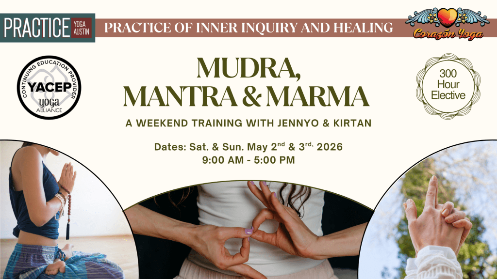 Coming… 300 hour Teacher Training led by JennyO with guest teachers. This will be a modular training–you can do the entire 300 hours to complete a 500 hour course. You can take them if you simply want to deepen your practice. The first course will be an Introduction to Ayurveda. If you would like more info please email me at Corazonyogaatx@gmail.com.